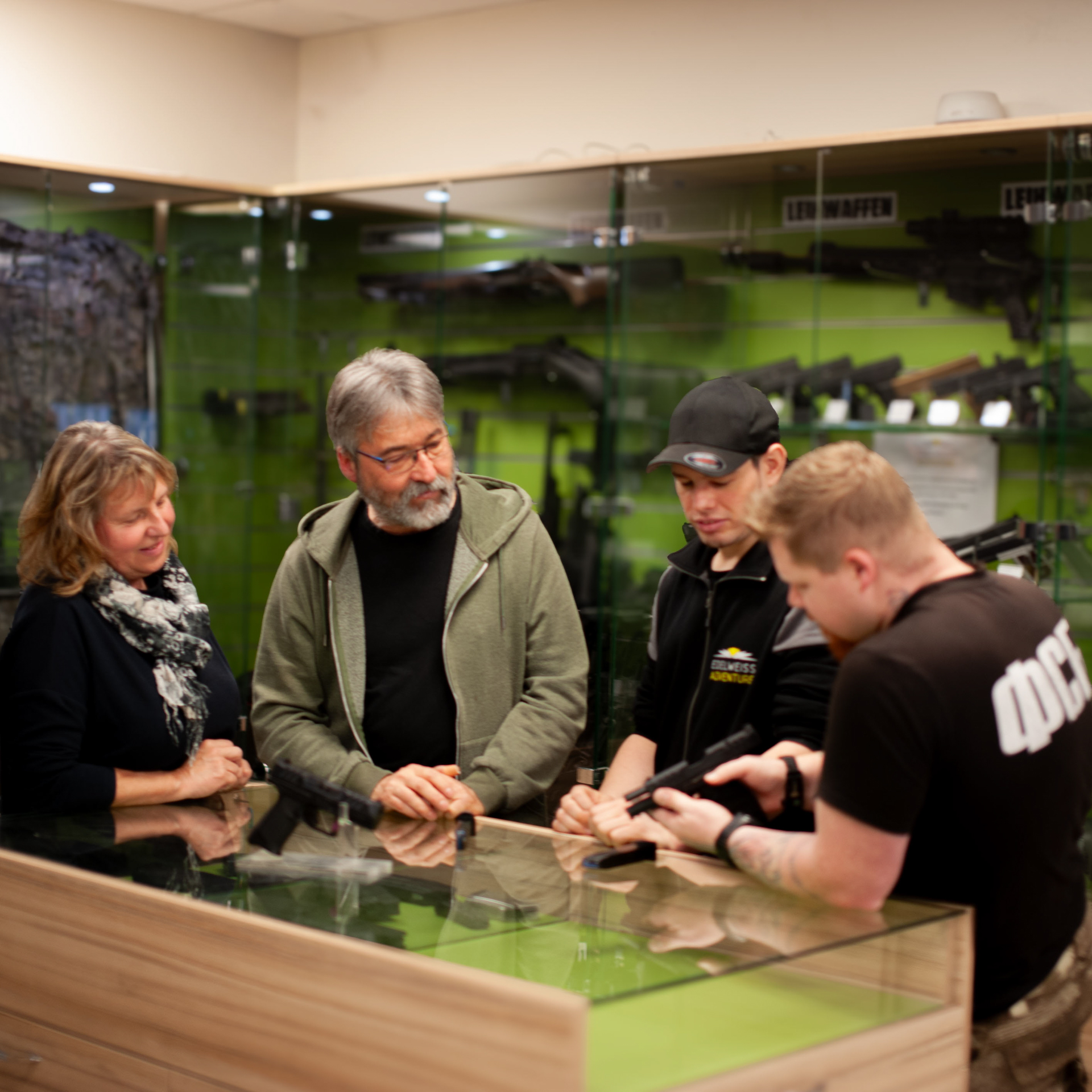 Du hast die Gelegenheit in sicherer Umgebung mit verschiedenen Waffen zu hantieren und dich umfassend über jedes Modell zu informieren.
